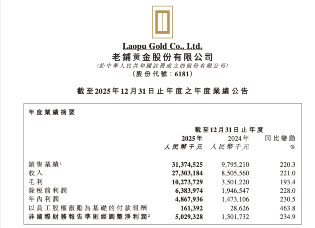 3月23日,古法手工金器品牌老铺黄金(6181.HK)发布截至2025年12月31日止年度业绩,以及2026年第一季度业绩预告。