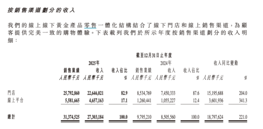 财报显示,2025年度,老铺黄金线下门店收入226.46亿元,同比增长204.0%,占总收入的82.9%;线上平台收入46.57亿元,同比增长341.3%,占总收入的17.1%。线上销售占比较2024年进一步提升,老铺黄金认为,这意味着随着品牌影响力的扩大,集团除一线城市以外的消费人群也快速扩大。