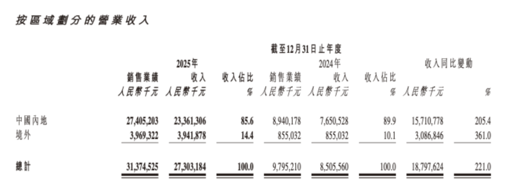 2025年度,老铺黄金境内收入为233.61亿元,占总收入的85.6%,同比增长205.4%;境外收入为39.42亿元,占总收入的14.4%,同比增长361.0%。老铺黄金认为,境外收入的快速增长,与该集团“品牌国际化、市场全球化”的发展战略一致。